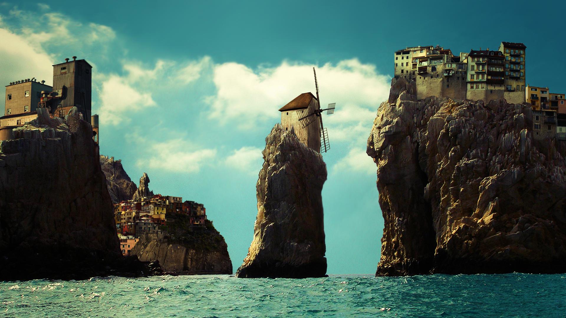 Город, скалы, море обои для рабочего стола, картинки, фото, 1920x1080. | ||||||||||||||||