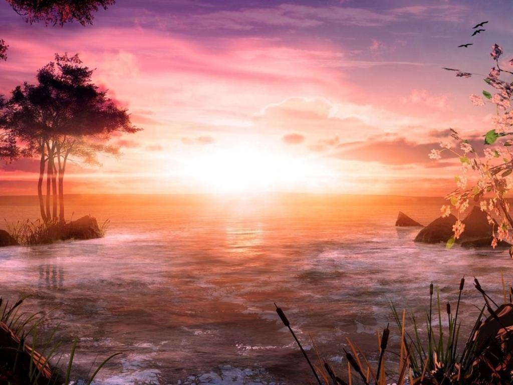 Озеро, солнце, деревья, облака обои для рабочего стола, картинки, фото, 1024x768. | ||||||||||||||||